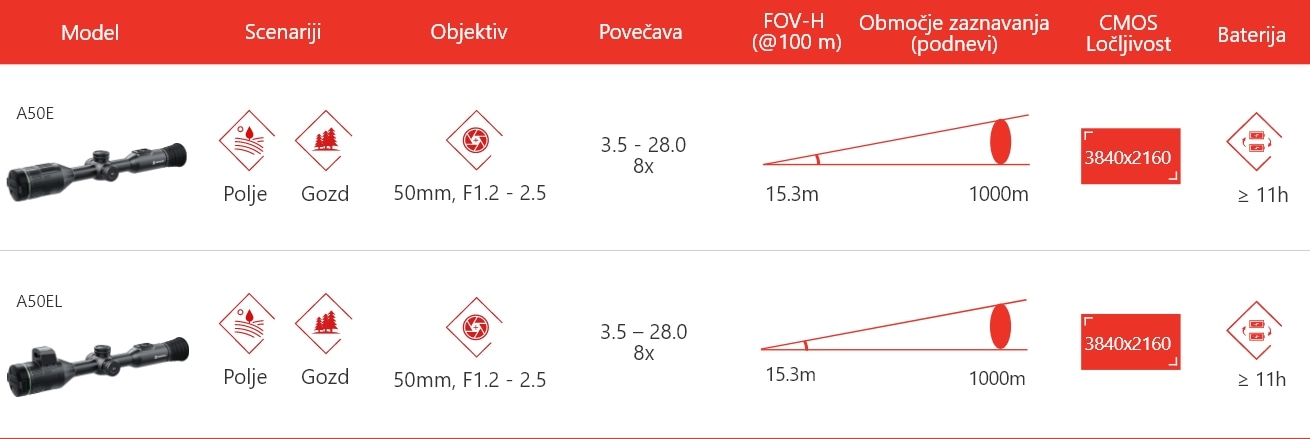 Modela ALPEX 4K A50E in A50EL združujeta napreden 4K UHD senzor, 50-milimetrsko goriščno razdaljo in nastavljivo zaslonko F1.2–F2.5 za vrhunsko vizualno izkušnjo podnevi in ponoči. Z vidnim poljem 15,3 m na 100 m sta idealna za lov v gozdu in na polju, pri čemer model A50EL vključuje še integriran 1000-metrski laserski daljinomer.