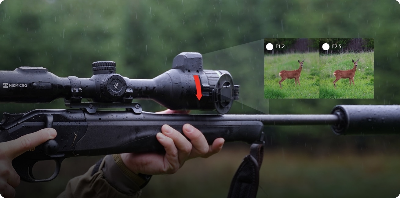 Nastavljiva zaslonka F1.2-2.5 kamere HIKMICRO ALPEX 4K izboljša prepoznavanje cilja v vseh svetlobnih pogojih. Uvedba velike zaslonke F2.5 lahko učinkovito prepreči prekomerno osvetlitev in izboljša globinsko ostrino, kar prinaša vizualno revolucijo tudi med dnevnim lovom.