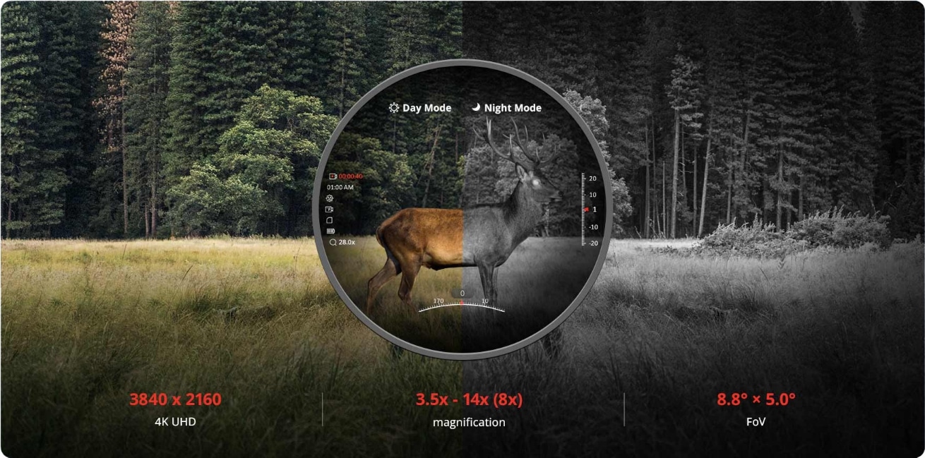 HIKMICRO ALPEX 4K je opremljen z detektorjem CMOS z ultra visoko ločljivostjo 3840 x 2160 in vam zato 24 ur na dan zagotavlja osupljive in brezprimerne podrobnosti slike. Z osnovno povečavo 3,5x in vidnim poljem 15,3 m na 100 m ponuja izjemno sposobnost zaznavanja in prepoznavanja ciljev v celotnem razponu povečave. Tudi v slabih svetlobnih pogojih ALPEX 4K zagotavlja izjemno podrobne slike.